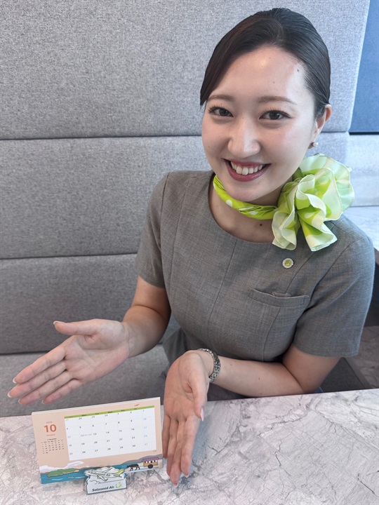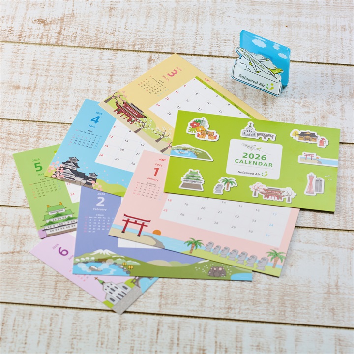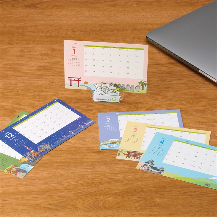 1 月の宮崎県サンメッセ日南のシンボル 「 モアイ像 」 に始まり、4月は熊本県の 「 熊本城 」 など、各就航地の象徴的なスポットがモチーフになっています!スタンド部分はソラシドエアの飛行機イラストをあしらったクリップになっており、ポストカードや記念写真など旅の思い出を挟んで飾ることもできます。 ※2026年は卓上カレンダーのみの販売です。